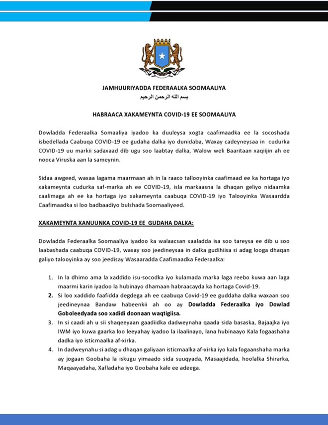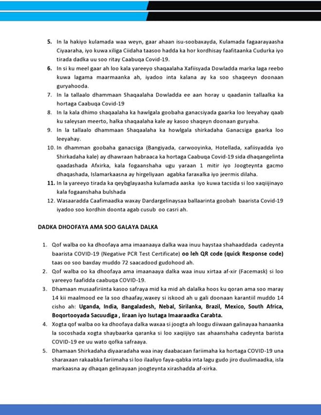 Talaado, September, 21, 2021 (HOL) - Wasaaradda caafimaadka dowladda Federaalka Somaaliya ayaa soo jeedisay in dowladda federalka iyo dowlad goboleedyada ay dib usoo celiyaan bandowgii habeenkii ee lagu xakamayay faafitaanka COVID-19.