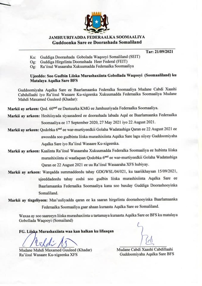 Talaado, September, 21, 2021 (HOL) - Waxaa goordhaw si rasmi ah loo soo saaray Liiska Musharaxiinta ku tartameysa kuraasta Aqalka sare ee gobolada Waqooyi ee Somaliland oo ay si wadajir ah usoo xuleen guddoomiyaha Aqalka Cabdi Xaashi Cabdullaahi iyo Raysal wasaare ku xigeenka dalka Mahdi Maxamed Guuleed.