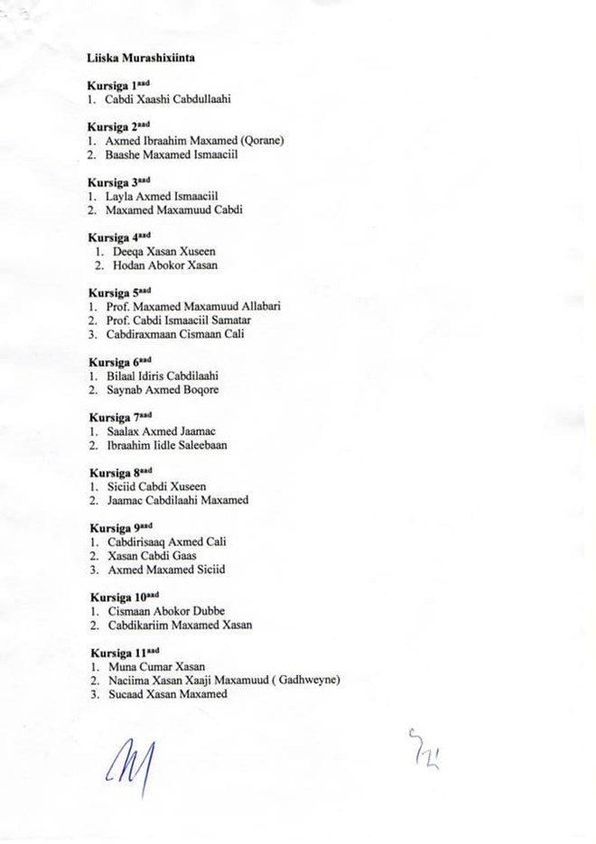 Liiska Musharaxiinta Aqalka sare ee maanta lagu wareejiyay Raysal wasaare Maxamed Xuseen Rooble ayaa waxaa kasoo dhex muuqday ilaa todobo Musharax oo haween.