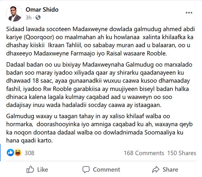newsinsideWasiiru dowlaha oo xalay bartiisa facebook kusoo daabacay qoraal dheer ayaa sheegay in ugu dambayn dadaaladii uu waday madaxweynaha Galmudug ay xalay kusoo dhamaadeen natiijo la’aan.