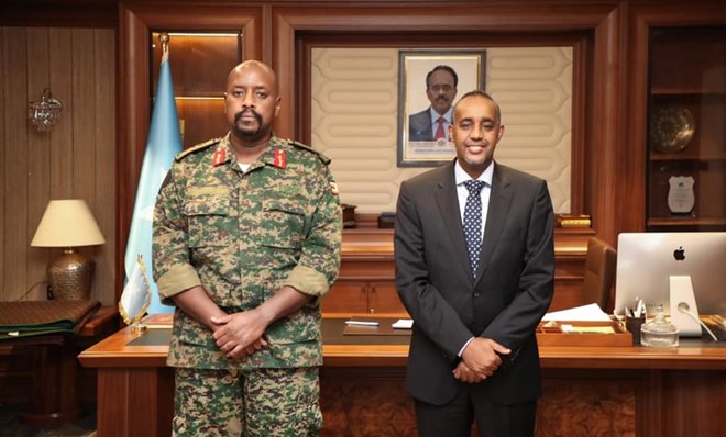 Isniin, September, 27, 2021 (HOL) - Taliyaha ciidamada Lugta dalka Uganda Lt. Genaral Muhoozi Kainerugaba iyo saraakiil kale oo ka tirsan ciidamada Uganda oo uu hogaaminaayay ayaa maanta soo gaaray magaalada Muqdisho waxayna si gooni gooni ah kulamo ula kala qaateen madaxweyne Maxamed Cabdullaahi Farmaajo iyo Raysal wasaaraha Maxamed Xuseen Rooble.