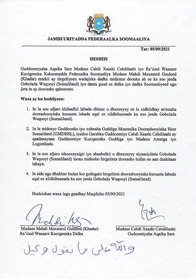 Axad, September, 5, 2021 (HOL) - Siyaasiyiinta gobolada waqooyi ee Somaliland oo ay kala hoggaaminayaan guddoomiyaha aqalka sare, Cabdi Xaashi iyo raysal wasaare ku xigeenka, Mahdi Guuleed ayaa heshiis rasmi ah ka gaaray arrimaha doorashada.