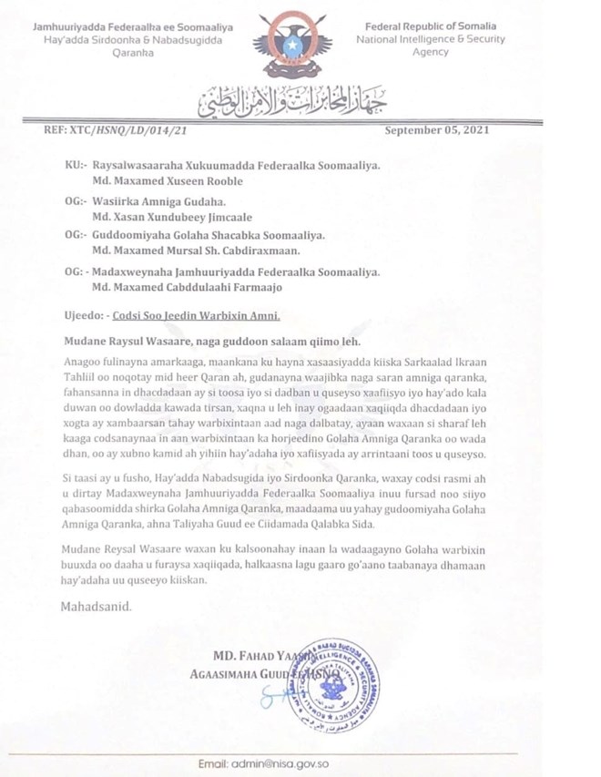 newsinsideQoraal lagu socod siiyay Ra’iisul wasaaraha oo la ogeysiiyay Wasiirka amniga, Guddoomiyaha Baarlamaanka iyo Madaxweyne Farmaajo, ayaa agaasimaha NISA wuxuu ku codsaday in warbixinta laga sugayo uu ku soo bandhigo kulan guddiga amniga qaranku yeesho.