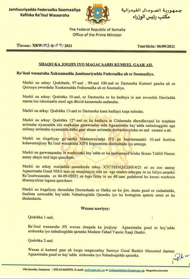 Axad, September, 5, 2021 (HOL) - Ra’iisul Wasaaraha Xukuumadda Federaalka Soomaaliya Mudane Maxamed Xuseen Rooble ayaa shaqada ka joojiyay Agaasimihii Hay’adda Nabad Sugidda iyo Sirdoonka Qaranka Fahad Yaasiin Xaaji Daahir, waxa uuna si KMG ah Agaasimaha guud ee NISA ugu magacaabay Sarreeye Guud Bashiir Maxamed Jaamac.