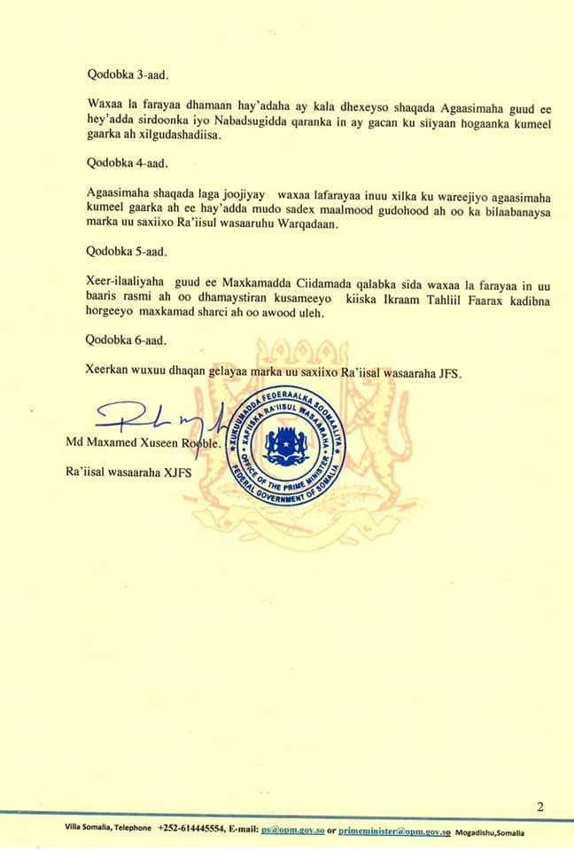 Halkaan ka Aqriso qoraalka kasoo baxay xafiiska Ra’iisul Wasaare Rooble :-