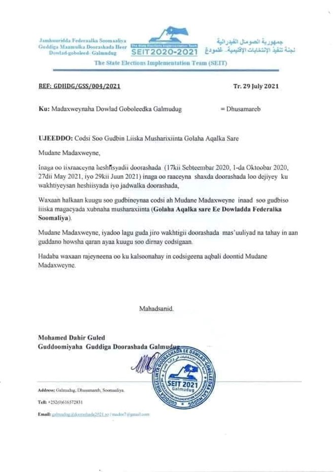 Axad, Agoosto, 1, 2021 (HOL) - Guddiga doorashada dowlad goboleedka Galmudug ayaa codsi u gudbiyay madaxweynaha maamulka Galmudug Axmed Cabdi Kaariye Qoorqoor.