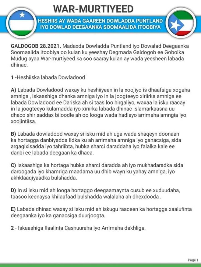 Sabti, Agoosto, 28, 2021 (HOL) - Puntland iyo dowlad deegaanka Soomaalida Itoobiya ayaa shir ay yeesheen waxay heshiis kaga gaareen arrimaha amniga iyo ganacsiga, sida lagu sheegay war murtiyeed kasoo baxay shirkaas oo ka dhacay degmada Galdogob ee gobolka Mudug.