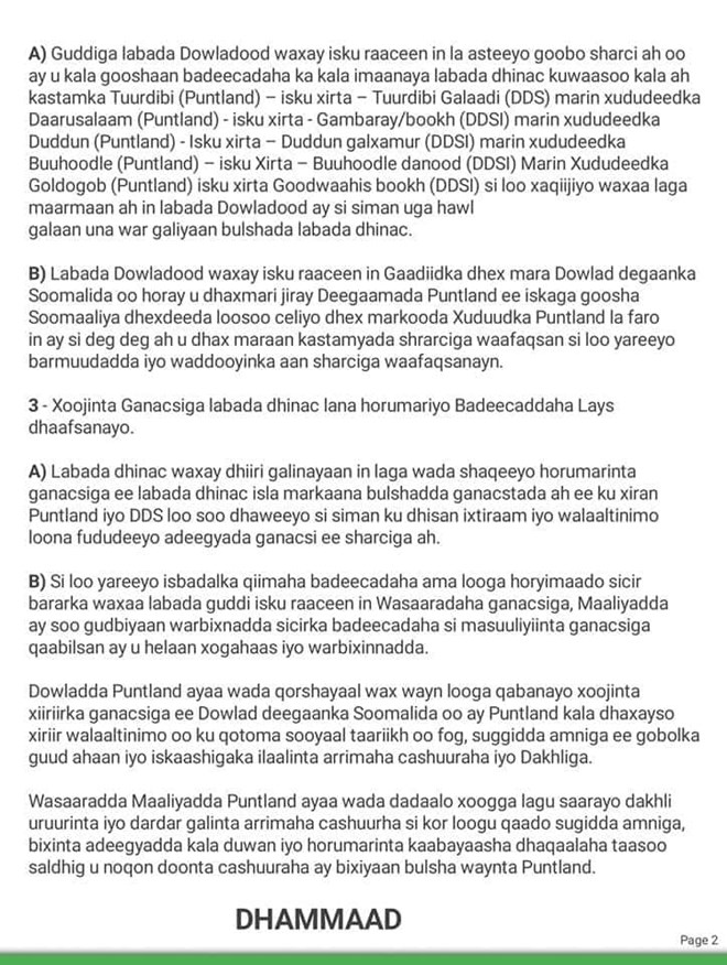 Wada xaajoodka labada dhinac ayaa kusoo aadaya, iyadoo Puntland ay ka cabanaysay maandooriyaha qamriga oo kasoo gala dhinaca dowlad deegaanka, halka dowlad deegaanku uu ka cabanayay hubka iyo waxyaabaha qarxa oo dhinaca Puntland lagasoo galiyo.