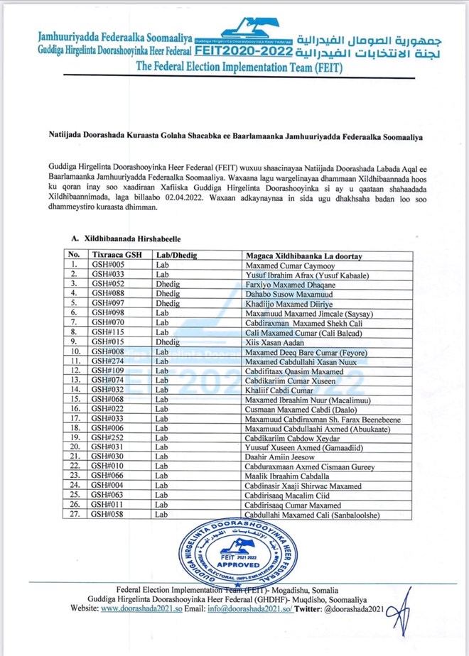 Jimco, April, 01, 2022 (HOL) - Guddiga heer federal ee hirgalinta doorashooyinka Soomaaliya ayaa ku dhawaaqay natiijada doorashada labada Aqal ee Baarlamaanka Jamhuuriyadda Federaalka Soomaaliya.