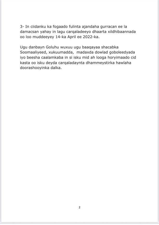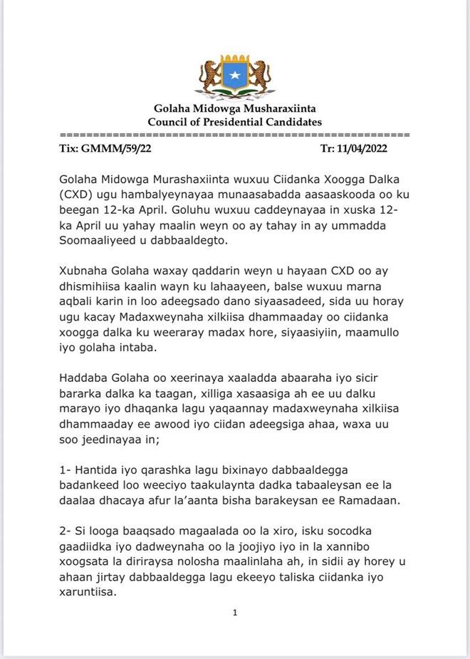 newsinsideQoraalka kasoo baxay Golaha Musharaxiinta ayaa sidoo kale loogu baaaay ciidanka Xoogga dalka inay ka fogaadaan in loo adeegsado dano siyaasadeedka gaarka ah ee uu doonayo madaxweynaha mudo xileddkiisa dhamaaday ee Maxamed Cabdullaahi Farmaajo.