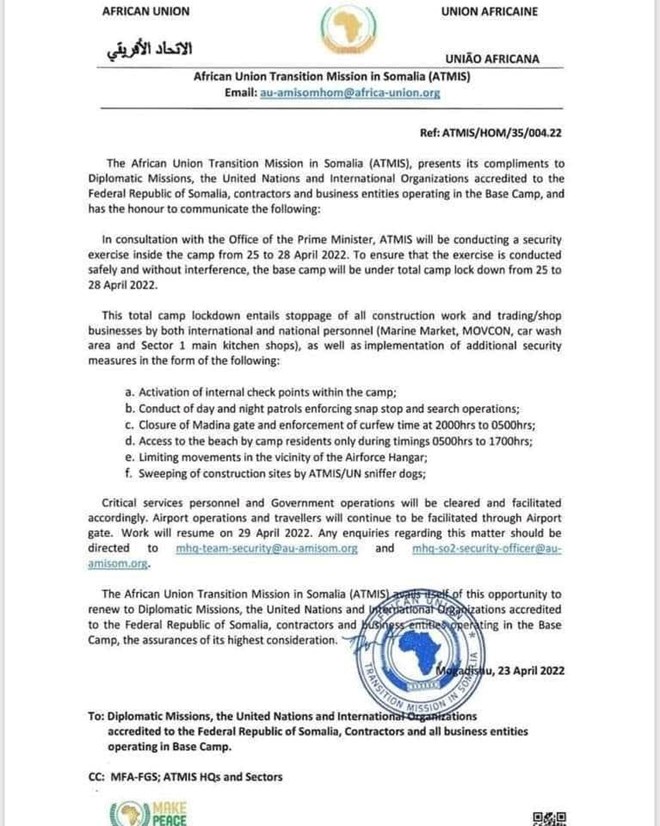 Isniin, April, 25, 2022 (HOL) - Howgalka kumeel gaarka ah ee nabad ilaalinta Midowga Afrika ee Soomaaliya (ATMIS) ayaa soo saaray war-saxaafadeed ay ku shaaciyeen bandow ay ku soo rogayaan xerada Xalane ee magaalada Muqdisho.
