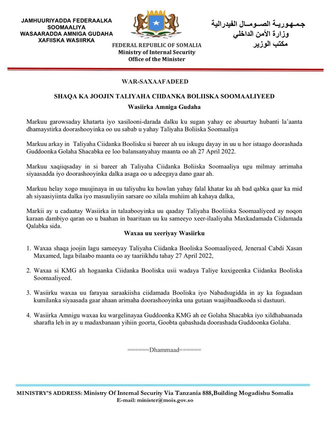 newsinsideWasiirka Amniga Soomaaliya ayaa taliyaha ciiddanka booliiska Soomaaliya ku eedeeyay inuu si bareer ah uu iskugu dayay in uu u hor istaago doorashada Guddoonka Golaha Shacabka ee loo balansanyahay maanta oo ah 27 April 2022.