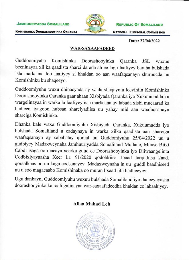 Arbaco, April, 27, 2022 (HOL) - Qoraal lagu baahiyay boga Guddida Doorashooyinka Somaliland, ayaa lagu sheegay in guddoomiyaha guddida Cabdirashiid Maxamuud Cali (Riyo-raac), uu wali yahay guddoomiyaha guddida.