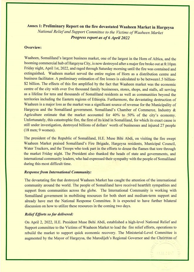 Arbaco, April, 6, 2022 (HOL) - Baaq ay soo saartay xukuumada Somaliland oo uu ku saxeexanyahay maxaxweyne Muuse Biixi Cabdi, ayaa beesha caalamka, ganacsatada iyo qurbjoogta lagaga codsaday in ay gacan ka gaystaan taakulaynta dadkii ku waxyeeloobay dhibaatada dabka baabiiyay suuqa Waaheen.