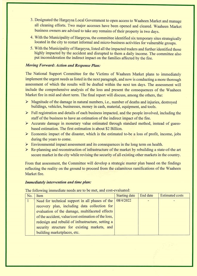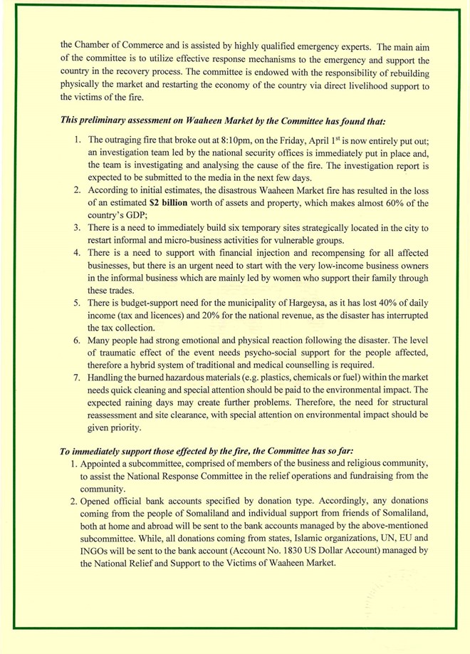 Baaqa ayaa lagu sheegay in gargaarka ay xukuumadu codsanayso la doonayo in cunto iyo hoy loogu sameeyo dadka aad u jilicda san, in dib loogu hagaajiyo dhismayaasha dhibtu soo gaadhay, in dowlada hoose laga caawiyo in ay samayso 6 goobood oo ku meel gaadh ah oo ay ganacsatadu ganacsigooda kusii wadan doonaan inta Waheen laga dhisayo.