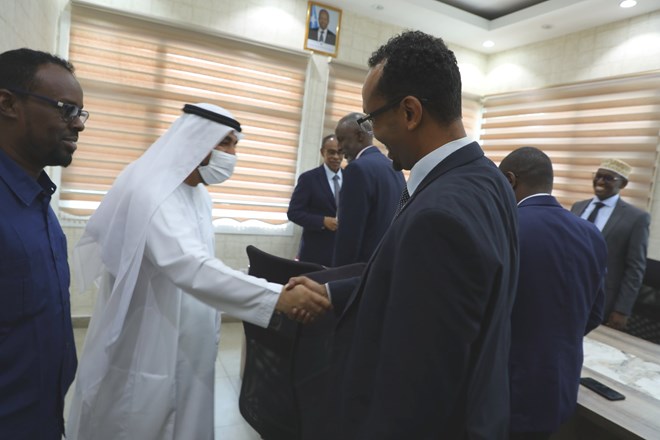 Sabti, Agoosto, 13, 2022 (HOL) - Wasiirka Wasaaradda Dekedaha Xukuumadda Fedaraalka Soomaaliya Cabdullaahi Axmed Jaamac Ilkajiir oo ay wehlinayeen wasiru dowlaha Xafiiska Raysal wasaaraha Soomaaliya Xirsi Jaamac Gaani, Xoghayaha Joogtada ee Xafiiska Raysal Wasaare Xamse, Maxamed Abuukar Zubeyr iyo masuuliyiin kale ayaa Maanta la wareegay deeq raashin oo ka timid dowladda Imaaraadka Carabta.