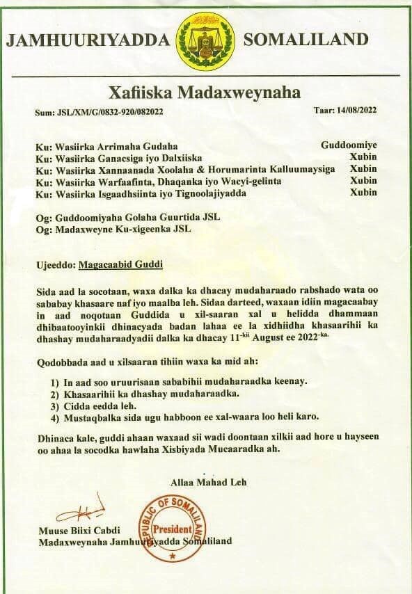 Talaado, Ogosto, 16, 2022 (HOL) - Madaxweynaha Somaliland Muuse Biixi Cabdi, ayaa guddi wasiiro ah, u saaray in ay soo baadhaan sababta keentay mudaharaadkii Khamiistii, khasaaraha ka dhashay, cida eedda leh, iyo sida xal mustaqbal oo waara loogu heli karo.