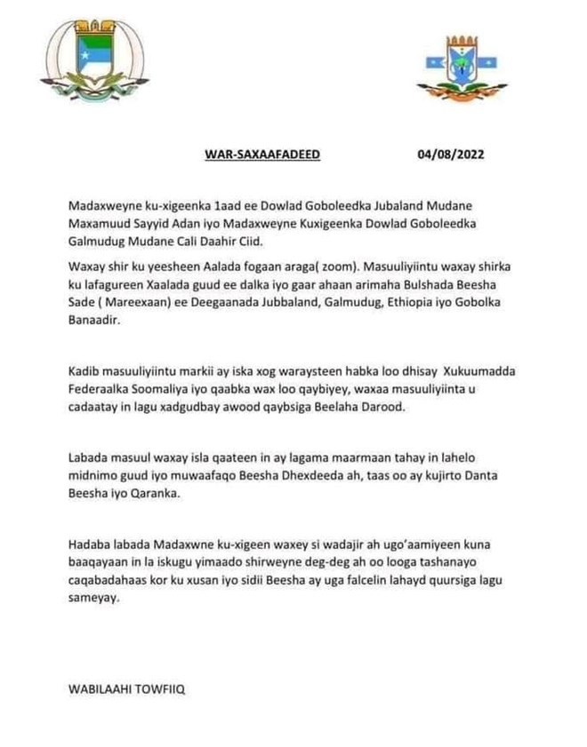 "Waxaan Maanta shir kuwada yeelanay aalada fogaan araga ee (Zoom) Madaxweyne Ku-xigeenka Dowladda Galmudug Cali Daahir Ciid, Shirkaa oo aan ku lafa gurnay Xaalada guud ee dalka iyo gaar ahaan arimaha Bulshada Beesha Sade Mareexaan ee Deegaanada u ah Jubaland, Galmudug, Ethiopia iyo Gobolka Banaadir. Shirkaas oo si wadajir ah ku go'aaminey kuna baaqnay in la iskugu yimaado shirweyne deg-deg ah oo looga tashanayo caqabadaha ku xusan iyo sidii Beesha ay uga falcelin lahayd quursiga lagu sameeyay ee dhisida golaha wasiirda ee dowlada dhexe" ayuu yiri madaxweyne ku xigeenka Jubbaland .