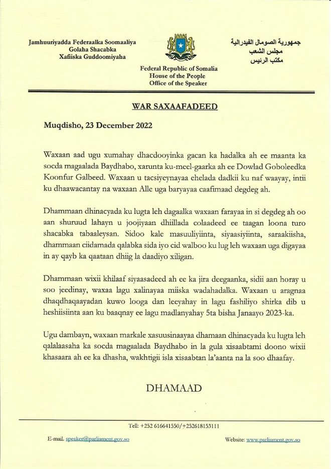 newsinsideGuddoomiyaha barlamaanka Soomaaliya oo soo saaray war-saxaafadeed ayaa ku baaqay in si degdeg ah loo joojiyo colaadda dhiiggu ku daatay, isagoo ugu yeeray dhinacyada is haya inay yimaadaan miiska wada hadalka.