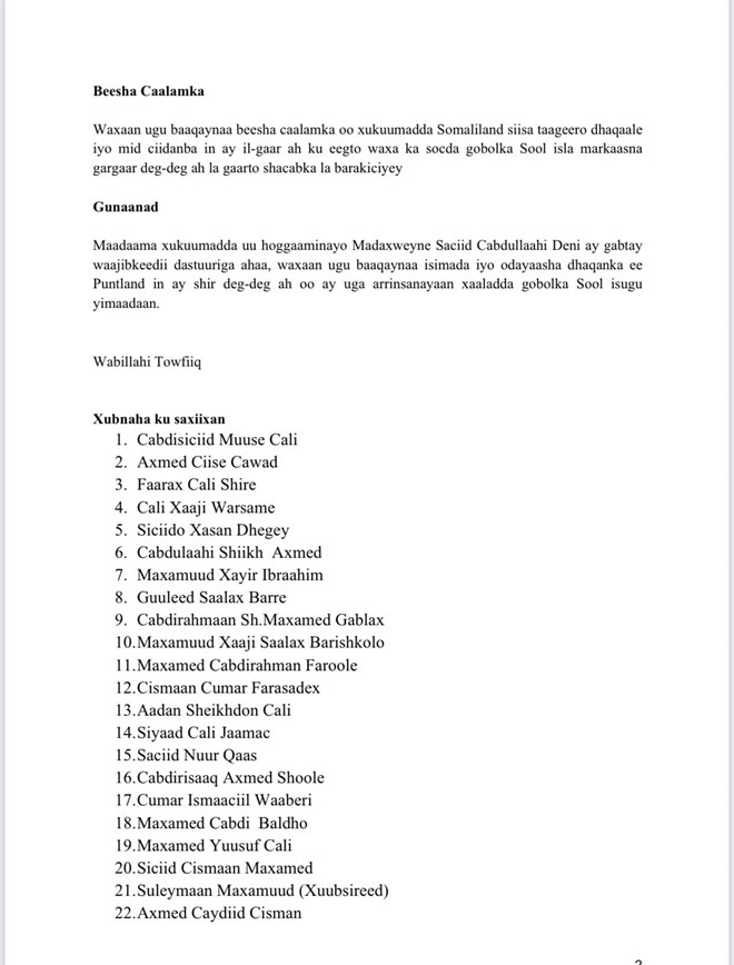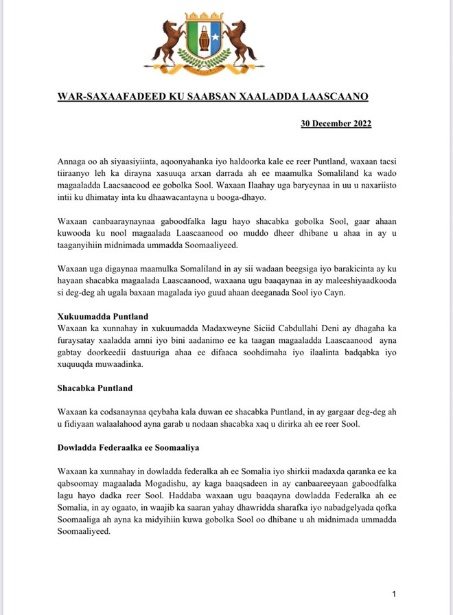Jimco, December, 30, 2022 (HOL) - Qaar ka mid ah Siyaasiyiinta ka soo jeeda deegaanada maamulka Puntland, islamarkaana qaarkood xilal ka soo qabtay dowladda Fedaraalka Soomaaliya ayaa Maanta war saxaafadeed ka soo saaray Xaalada mafaalada Laascaanood ee gobolka Sool.