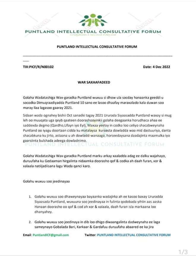 Axad, December, 4, 2022 (HOL) - Golaha wadatashiga iyo waxgaradka Puntland oo ah gole ay ku midaysan yihiin qaar kamid ah siyaasiyiinta, waxgaradka iyo aqoonyahannada ayaa ka digay waxay ugu yeereen xasilooni darro siyaasadeed oo ka dhalan karta muddo kororsiga madaxweyne Deni.