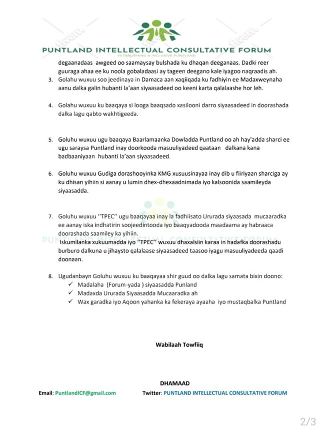 newsinsideWarsaxaafadeed ay soo saareen ayay ku baaqeen in doorashada waqtigeedii aan laga dib dhigin, waxayna barlamaanka ugu baaqeen inay Puntland ka bad-baadiyaan hubanti la’aan siyaasadeed.