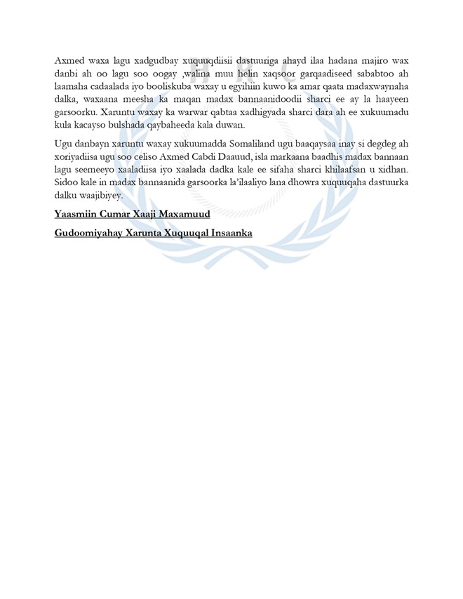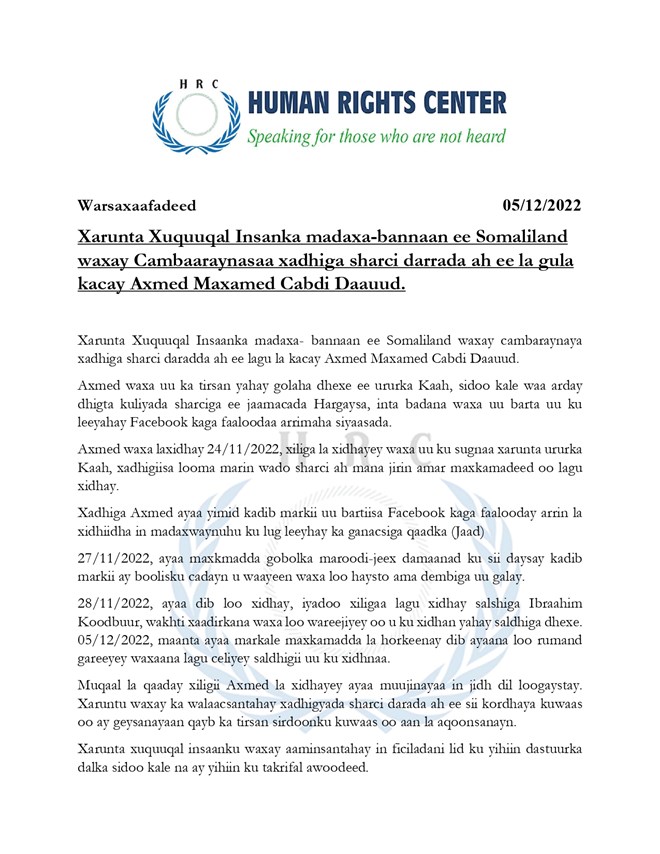 newsinside"Xarunta Xuquuqal Insaanka Madaxa-bannaan ee Somaliland, waxa ay cambaaraynaysa xadhiga sharci darada ah, ee lagula kacay Axmed Maxamed Cabdi Da'uud, Axmed waxa uu ka tirsanyahay Golaha Dhexe ee Ururka Kaah" ayaa lagu yidhi warbixinta xarunta.