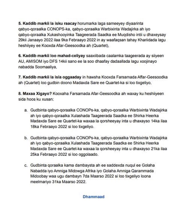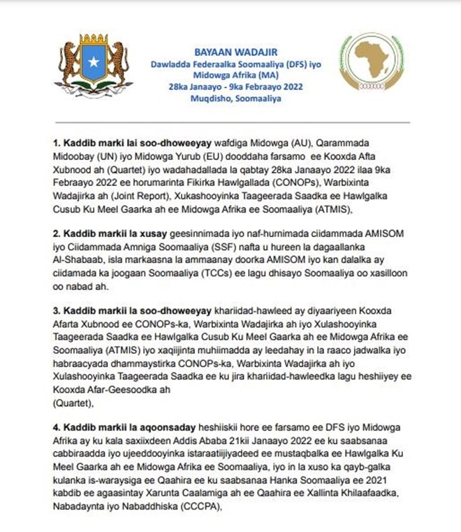 Khamiis, Febraayo, 10, 2022 (HOL) - Dowladda Federaalka Soomaaliya iyo Midowga Afrika ayaa soo gabagabeeyey shirkoodii ay kaga wadahadlayeen waajibaadka shaqo ee loo igmaday, qaabka uu u shaqaynayo hawlgalka cusub ee Midowga Afrika ee Soomaaliya.