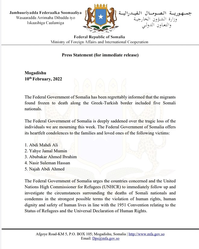 Khamiis, Febraayo, 10, 2022 (HOL) - Dowladda federaalka Soomaaliya ayaa wax laga xumaado ku tilmaamtay in dad tahriibayaal ah oo ku geeriyooday xadka Giriiga iyo Turkiga ay ku jireen dhallinyaro Soomaali ah.
