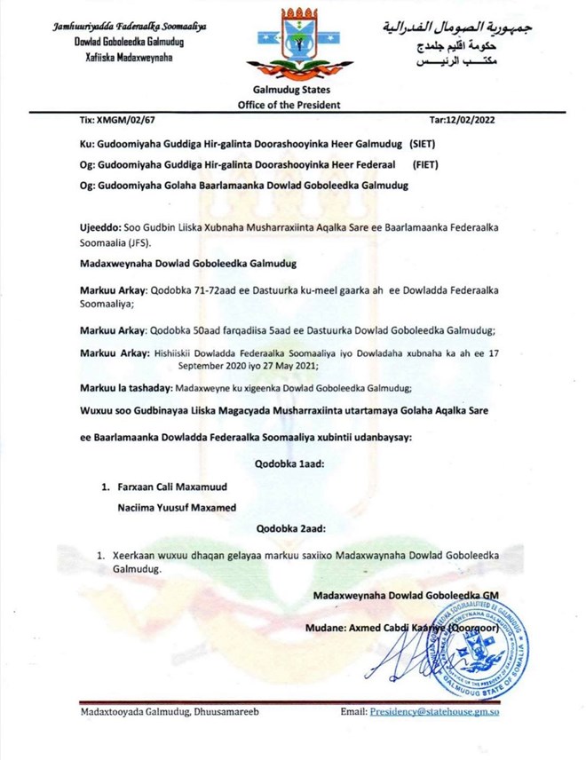 Sabti, Febraayo, 12, 2022 (HOL) - Madaxweynaha Galmudug, Axmed Cabdi Kaariye, ayaa soo saaray liiska Musharixiinta u tartamaya xubintii ugu dambeyday ee golaha Aqalka Sare ee Baarlamaanka dowladda Federalka Soomaaliya.