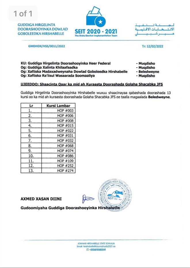 Axad, Febraayo, 13, 2022 (HOL) - Guddiga doorashada maamulka Hirshabeelle ayaa shaaciyay liiska 13 kursi oo ka mid ah kuraasta Golaha Shacabka Baarlamaanka 11-aad ee dalka, kuwaas oo deegaan doorashadoodu tahay magaalada Baledweyne ee xarunta gobolka Hiiraan.