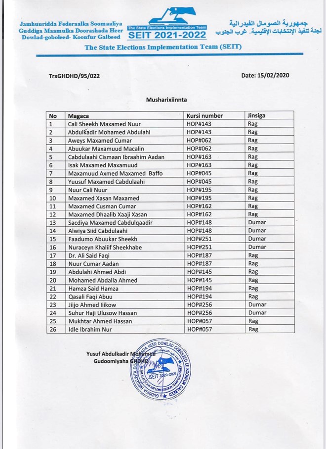 Hoos ka akhriso liiska Musharaxiinta 13-ka kursi ee Baraawe lagu dooranayo.
