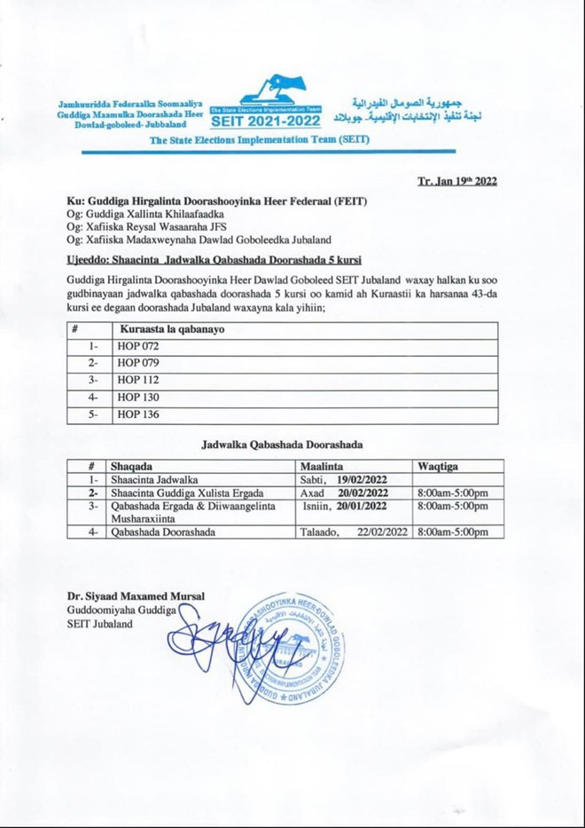 Axad, Febraayo, 20, 2022 (HOL) - Guddiga doorashada maamulka Jubbaland ayaa shaaciyay jadwalka qabashada doorashada 5 kursi oo ka mid ah kuraasta Golaha Shacabka ee deegaan doorashadoodu tahay Jubbaland.