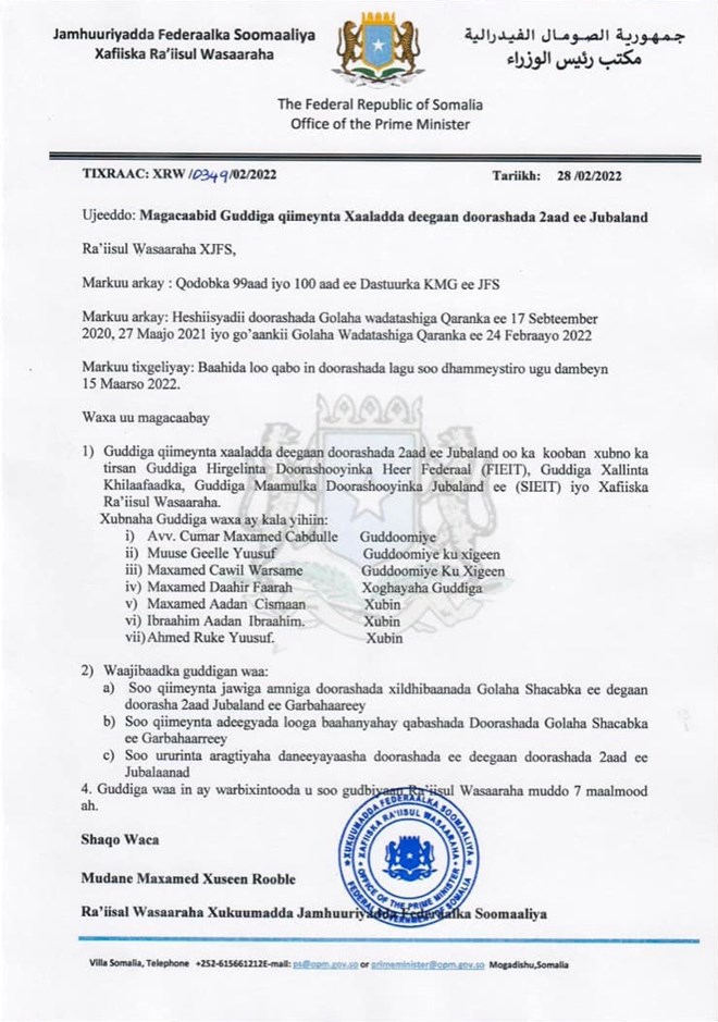 Isniin, Febraayo, 28, 2022 (HOL) - Raysal wasaaraha Xukuumadda Fedaraalka Soomaaliya Maxamed Xuseen Rooble ayaa magacaabay guddi soo qiimeynaya xaalada deegaan doorashada labaad ee maamulka Jubbaland oo ah magaalada Garbahaareey ee gobolka Gedo.