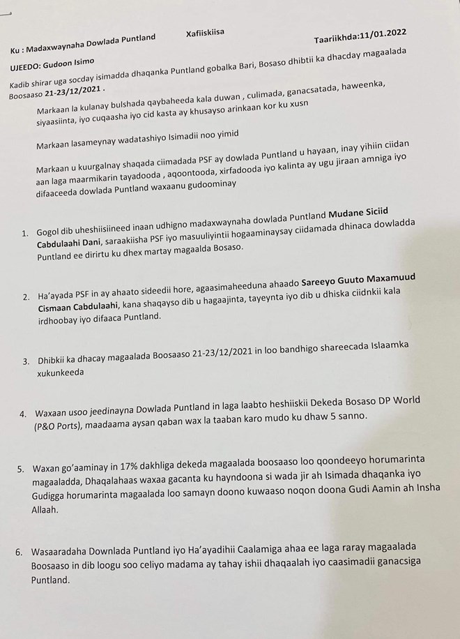 Isimada waxay soo jeediyeen go'aan ah in laga laabto heshiiska hay'adda DP world ay ku naamulayso dekeda magaalada Boosaaso. Waxayna ku eedeeyeen DP world in aanay wax ka qaban dekeda Bosaso.