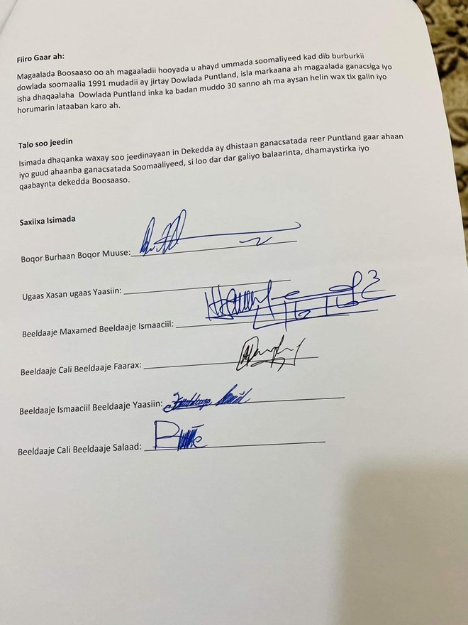 newsinsideIsimada oo maalmahan uu shir uga socday Boosaaso ayaa bayaan ay soo saareen waxay ku sheegeen inay gogol dib u heshiisiineed u dhigeen madaxweyne Deni iyo masuuliyiinta hay'adda PSF.