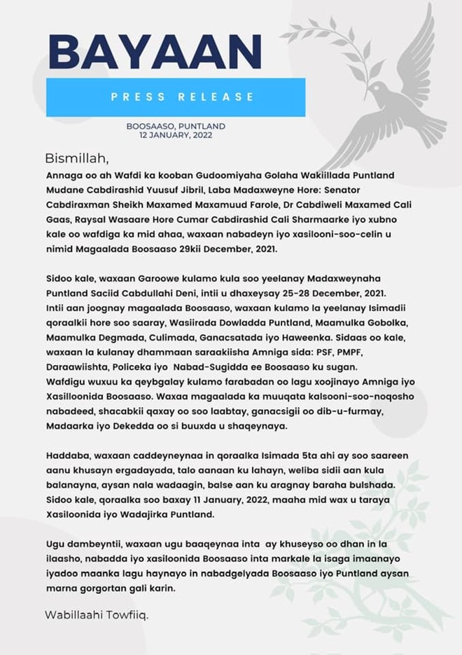 Madaxweynaha Puntland Siciid Deni oo shalay dib ugusoo laabtay magaalada Garowe ayaa la filayaa inuu ka hadlo arrintaan, inkastoo uu ka baaqsaday safarkii uu ku aadi lahaa magaada Bosaso.