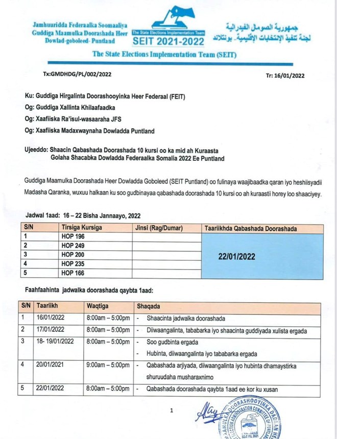 Axad, Janaayo, 16, 2022 (HOL) - Guddiga doorashada heer dowladd Goboleed ee Puntland oo fulinaya heshiisyadii Madashada qaranka, ayaa maanta soo saaray qabashada jadwalka Doorashada ee 10 kursi oo ah kuraastii horey loo shaaciyay.