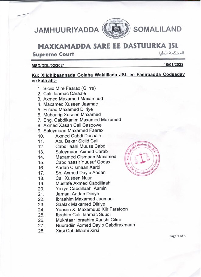 Axad, Janaayo, 16, 2022 (HOL) - Maxkamada Sarre ee Somaliland, ayaa gabi ahaanba diiday dacwadii ay 46 xildhibaan oo ka tirsan golaha wakiilada ay ku doonayeen in maxkamadu ay fasiraad kaga bixiso qodobada 77aad iyo 78aad ee dastuurka ee la xidhiidha xeerka furista urrada siyaasada. Maxkamada ayaa sidookale aqbashay dacwad ay u gudbiyeen 24 siyaasi.