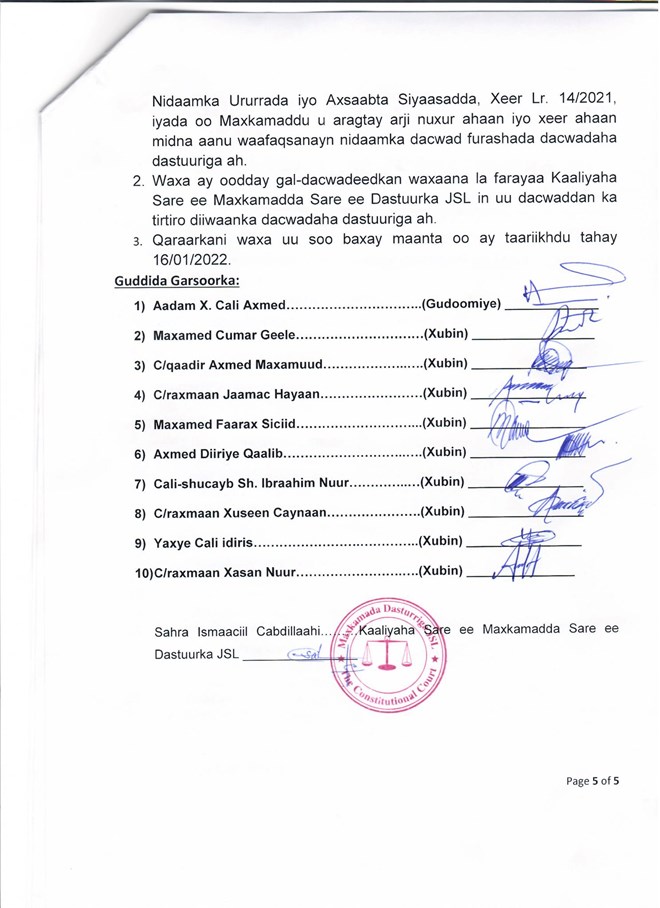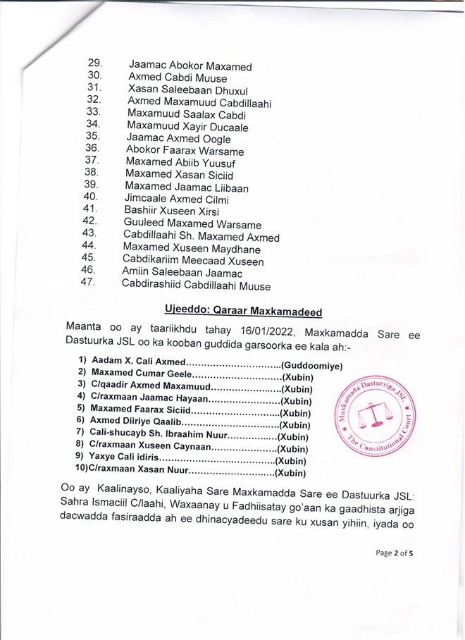 newsinsideMaxkamada ayaa diiday dacwada ay u gudbiyeen xildhibaannadu ee ku saabsanayd fasiraada qodobada 78 iyo 77 ee dastuurka ee la xidhiidha dhaqangalka, kaabista iyo wax kabadalka xeerka nidaamka ururrada iyo axsaabta, nuxurkiisuna ahaa in xubnuhu codsadeen fasiraad.