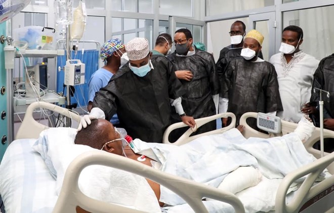 Isniin, Janaayo, 17, 2022 (HOL) - Raysal wasaaraha xilgaarsiinta Xukuumadda Fedaraalka Soomaaliya Maxamed Xuseen Rooble ayaa Isbitaalka ku booqday Afhayeenka Xukuumadiisa Maxamed Ibraahin Macalimuu oo shalay ku dhaawacmay qarax Ismiidaamin ah oo lala eegtay gaarigiisa.