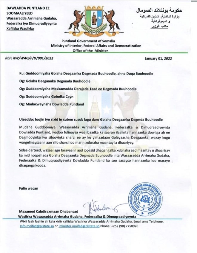 Axad, January, 2, 2022 (HOL) - Wasaaradda arrimaha gudaha Puntland ayaa joojisay dhaqangalka 6 Xubnood oo uu Duqa Degmada Buuhoodle u dhaariyey ka mid noqoshada Golaha Deegaanka Buuhoodle ee Gobolka Cayn.