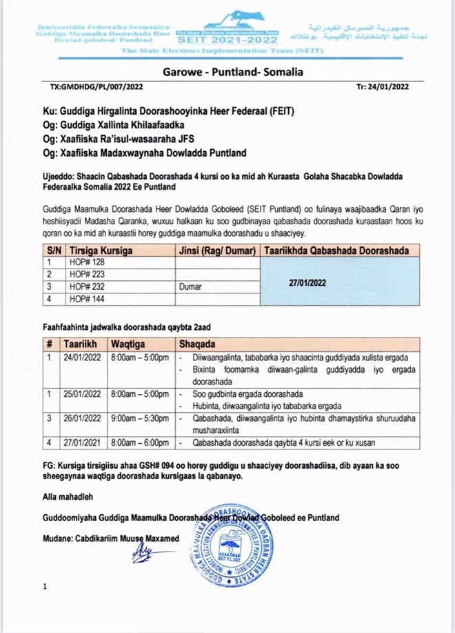 Talaado, Janaayo, 25, 2022 (HOL) - Guddiga doorashada heer dowlad goboleed ee Puntland ayaa soo saaray jadwalka doorashada afar kursi oo aqalka hoose ah, sida lagu sheegay warsaxaafadeed guddiga uu soo saaray.