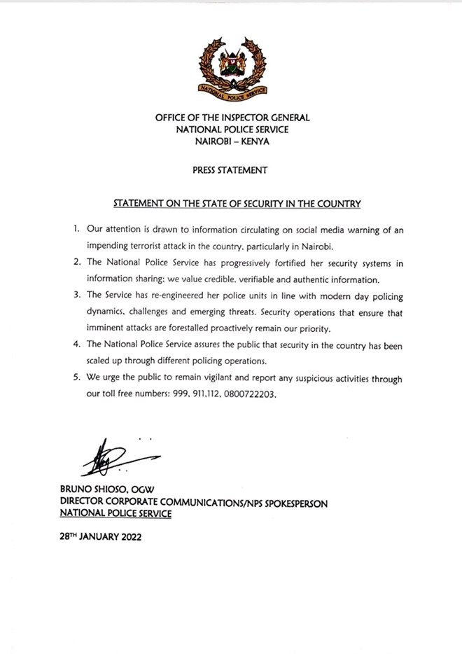 newsinsideAfhayeenka Booliiska dalka Kenya, Bruno Shioso ayaa bayaan uu soo saaray ku sheegay, in ammaanka Kenyaanka si weyn loo adkeynayo guud ahaan dalkaas.