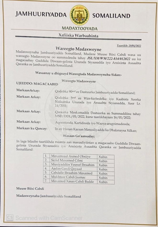 Sabti, Janaayo, 29, 2022 (HOL) - Madaxweynaha Somaliland Muuse Biixi Cabdi, ayaa todoba xubnood u magacaabay in ay noqdaan guddida diwaangalinta iyo ansixinta urrurada siyaasada Somaliland, oo la filayo in doorashadoodu dhacdo dabayaaqada sannadkan.