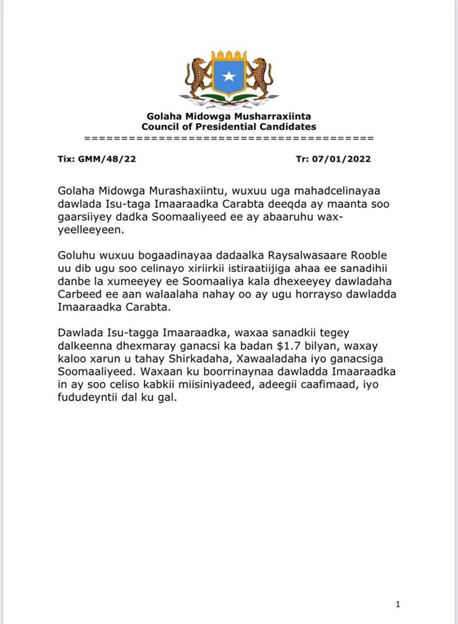 Jimco, Janaayo, 7, 2022 (HOL) - Golaha Midowga Musharaxiinta Madaxweynaha Soomaaliya ayaa ku bogaadiyay Raysal wasaaraha Soomaaliya Maxamed Xuseen Rooble dadaalka uu ku doonayo inuu dib usoo celiyo xiriirkii istaraatijiga ahaa ee ka dhaxeeyay dowladaha Soomaaliya iyo Imaaraadka Carabta oo ay sheegeen in la xumeeyay sanadahii u dambeeyay.