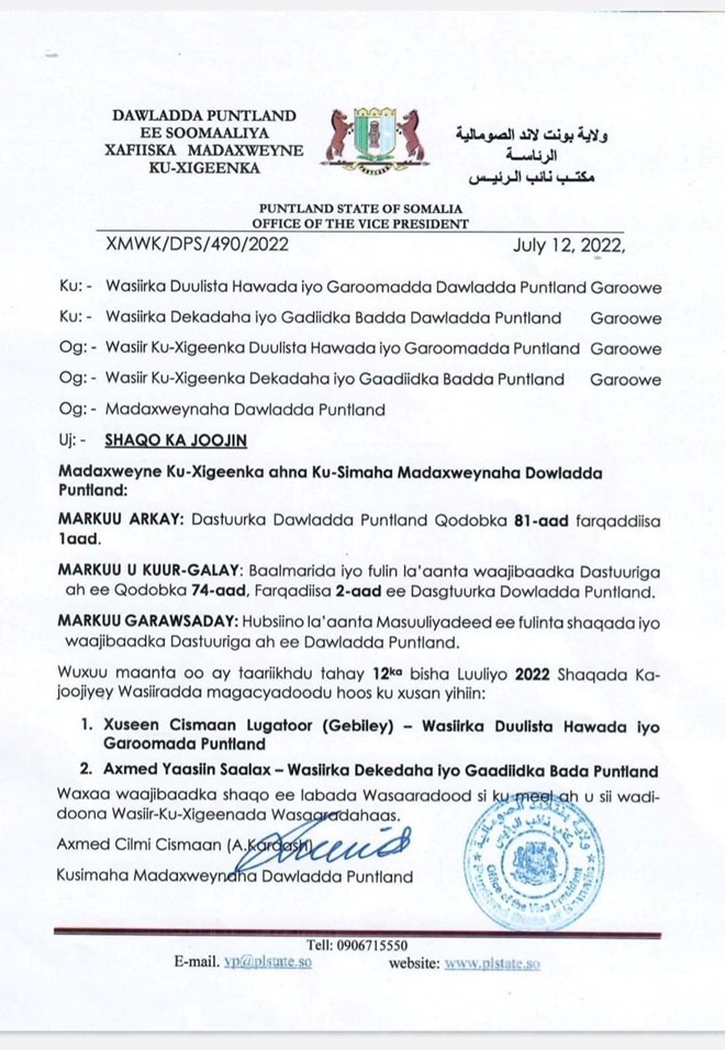 Talaado, July 12, 2022 (HOL) - Madaxweyne ku-xigeenka Puntland, Axmed Karaash, ahna ku simaha madaxweynaha, ayaa shaqo joojin ku sameeyey labo wasiir oo kala ah, wasiirka duulista iyo garoomada iyo sidoo kale wasiirka dekedaha iyo gaadiidka badda.