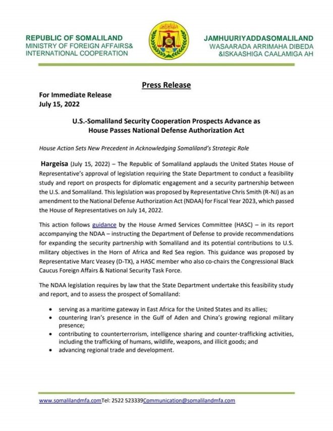 "Jamhuuriyada Somaliland waxay u sacabtumaysa meel-marinta Golaha Wakiilada Maraykanka ku sameeyeen xeerka ogolaanaya in wasaarada arrimaha dibaddu ay samayso cilmi-baadhis iyo ka warbixin xidhiidh amaan oo ay yeeshaan Maraykanka iyo Somaliland" ayaa lagu yidhi warsaxaafadeedka.