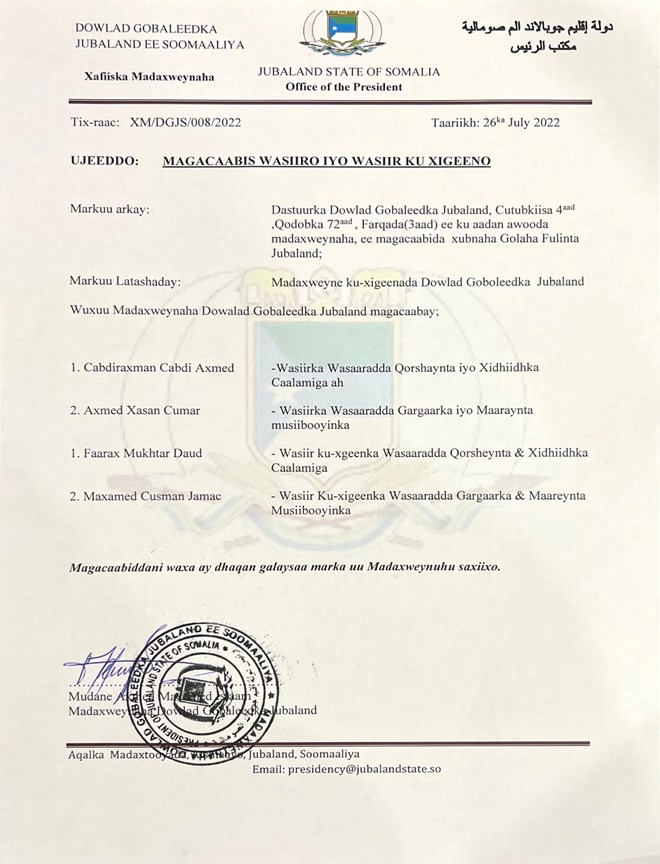 Arbaco, Luulyo, 27, 2022 (HOL) - Madaxweynaha maamul goboleedka Jubbaland Axmed Maxamed Islaam Madoobe ayaa wareegto kasoo baxday Xafiiska ku magacaabay wasiiro iyo wasiir ku xigeeno ka tirsan Xukuumaddiisa, ayadoo la isku badelay Wasaaraddaha qaar.