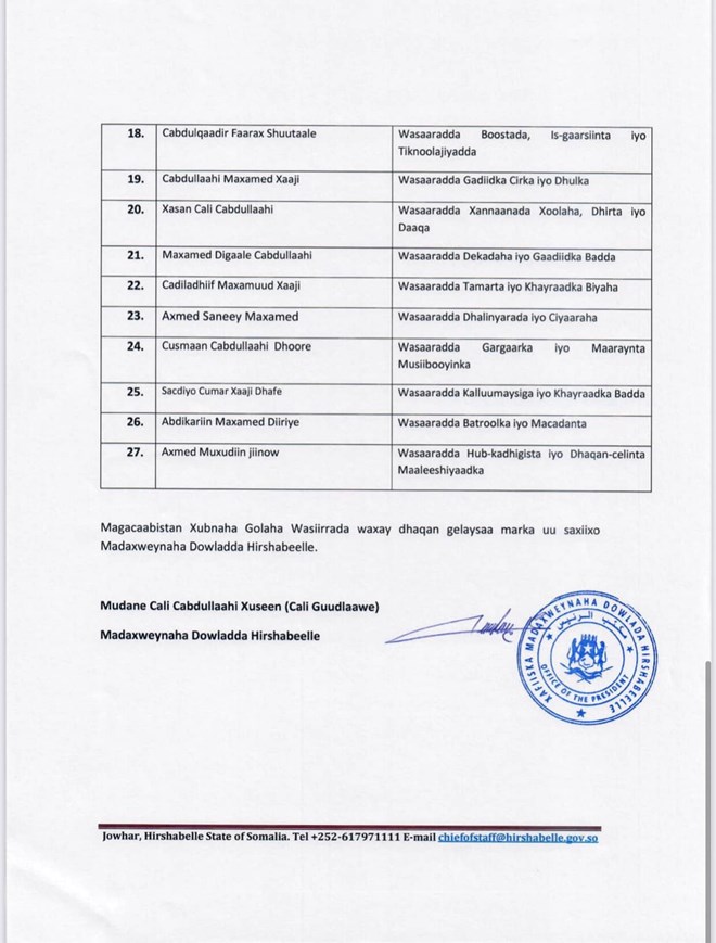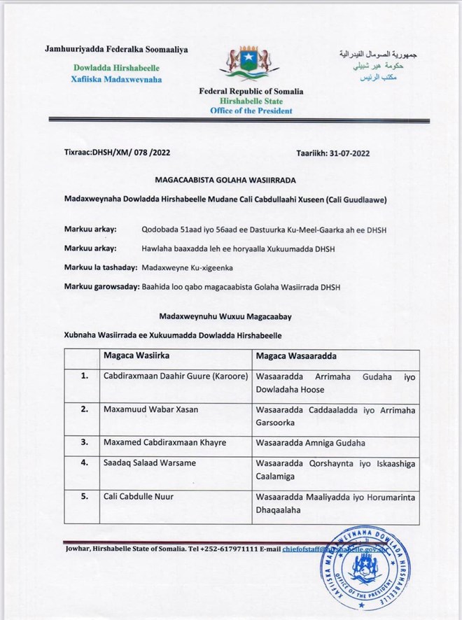 Axad, Luulyo, 31, 2022 (HOL) - Madaxweynaha Hirshabelle , Cali Cabdullaahi Xuseen (Cali Guudlaawe) ayaa goor dhow magacaabay golaha wasiirrada , ka dib labo sanno oo u xafiiska joogay.